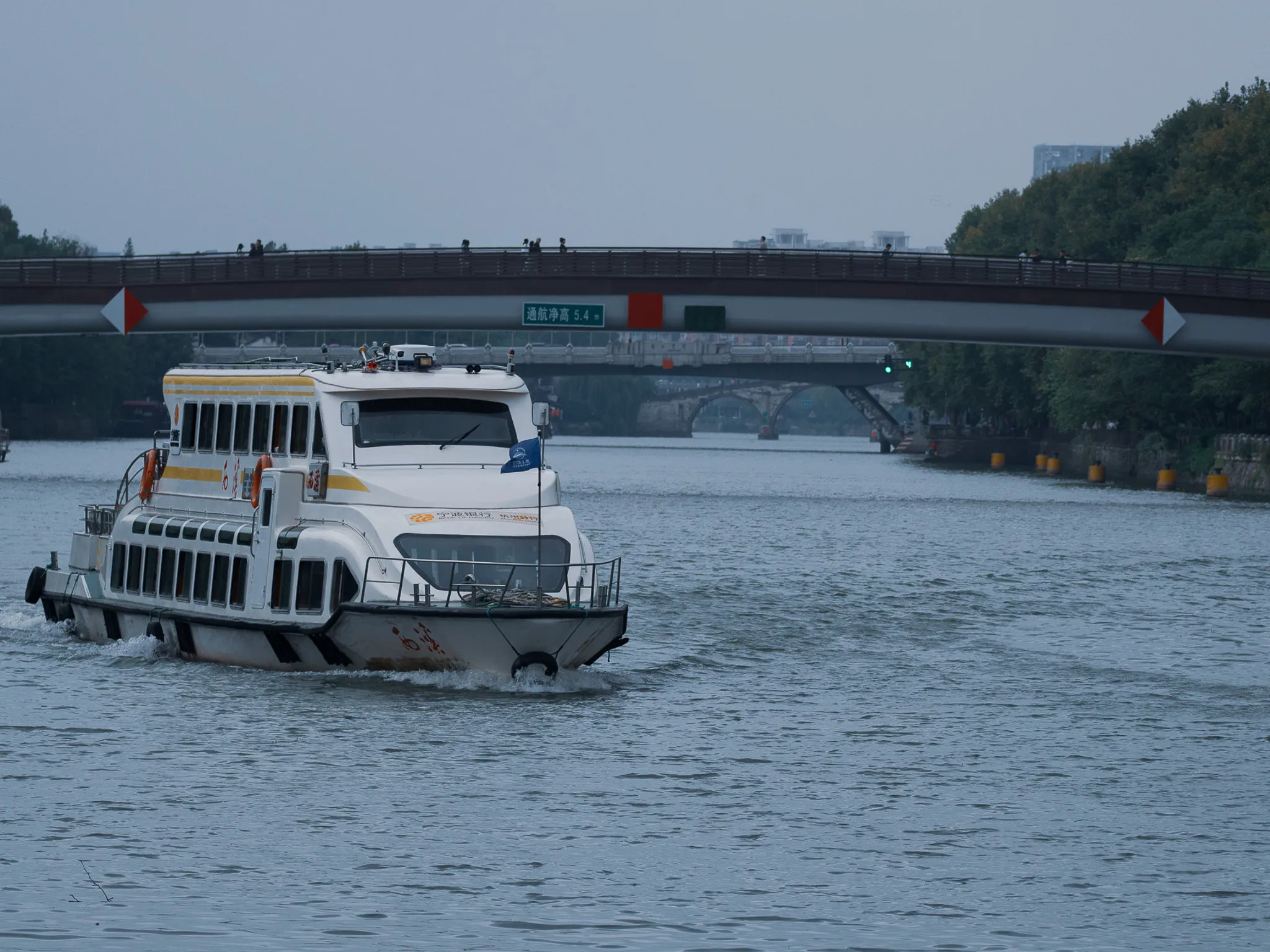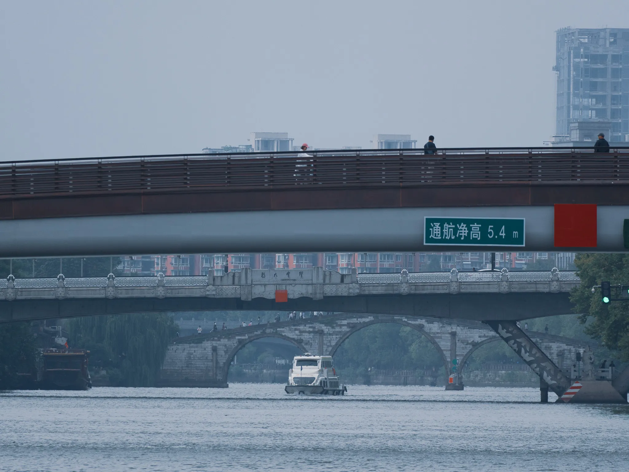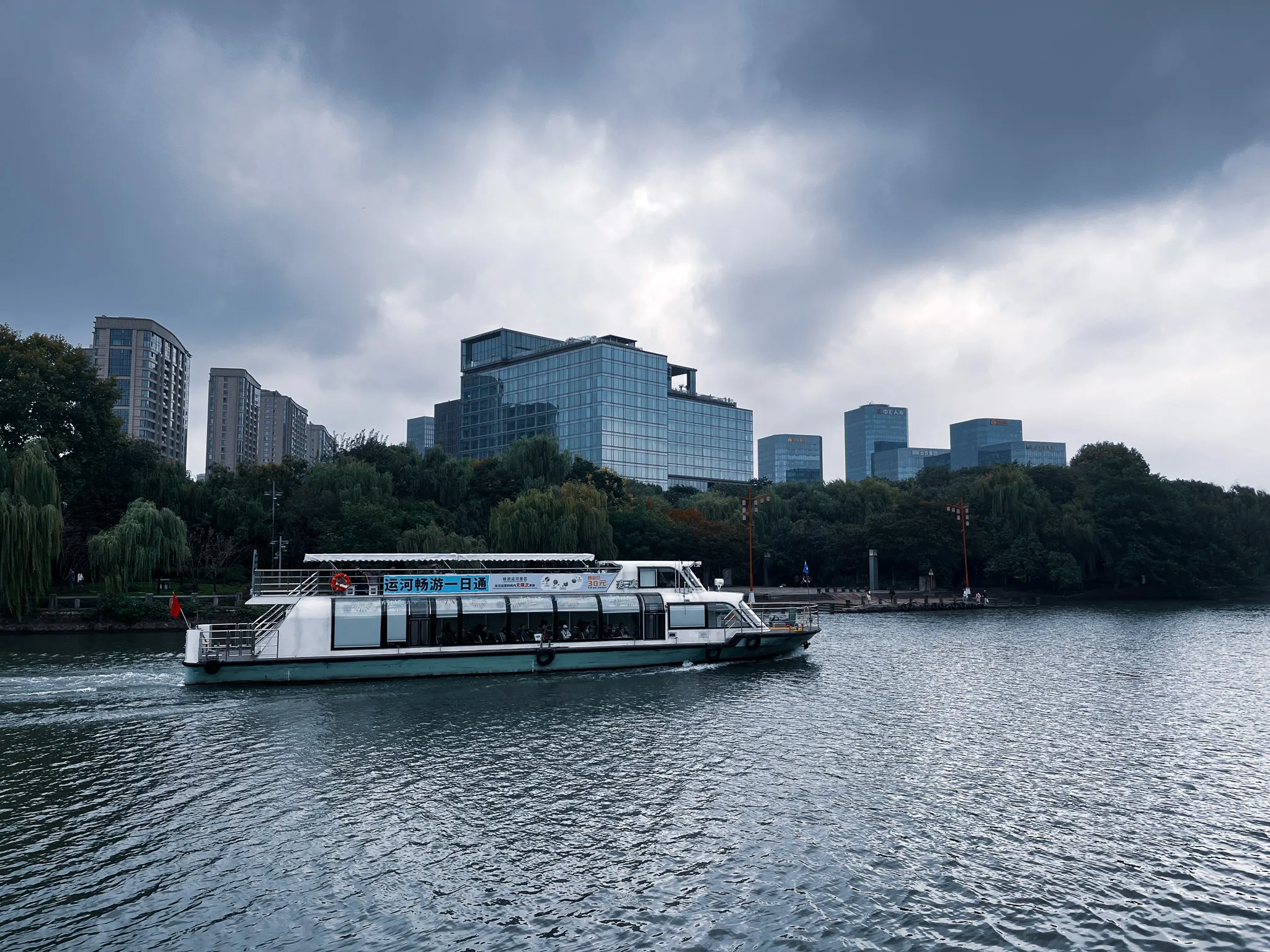 拱宸桥 国庆后回来的第一个周末,正好赶上降温,天气凉快了下来。来到了拱宸桥运河两岸溜达,运河两岸有历史商业街区、扇子博物馆、运河博物馆。运河边的道路修建的很好,很适合散步,桥的上下游不远处都有公园。沿着上游走,在一个公园内有一个星巴克,被建造在一个生锈的铁皮罐子里。再接着往上走,到达了香积寺,门店20元一位,所以就没进去了。香积寺门口的客机飞的很低,手机也可以拍的很大很清楚。 拱宸桥下路过的游船 2025.10.17 · 杭州京杭大运河